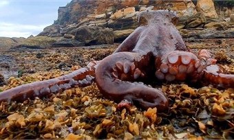 Daily Mail сообщает о нахождении местным жителем огромного голодного осьминога на побережье Сиднея (Австралия). Морской моллюск преодолевал каменные валуны и вполне спокойно чувствовал себя на суше.
